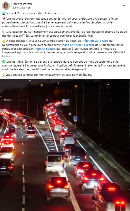 | 01/07/2025 | Réunion en sous-préfecture à Argenteuil Florence Portelli communique à la population les avancées du dossier sur son compte Facebook le 1er juillet 2025 "Sortie 115 : ça avance... dans le bon sens !". ![]() La mobilisation de chaque entité compétente a permis de poursuivre rapidement les discussions pour définir une solution technique pour la sécurisation de cette sortie d'autoroute. |